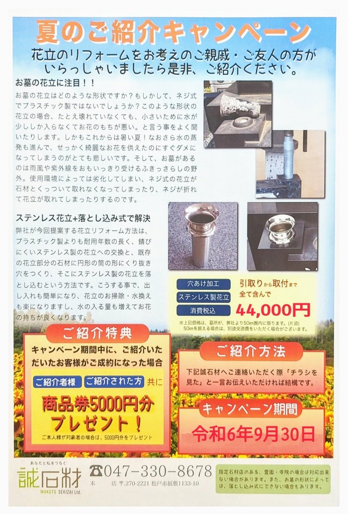 home誠石材 まこせきブログ〜石屋の日常〜 キャンペーン実施中☆ キャンペーン実施中☆ 2024.8.23 皆様ごきげんよう☆!誠石材は、夏のキャンペーンやってます! 9月末までのオススメイベントです!お墓のお花を添える花筒をリニューアルしませんか?? 石に穴を開け、そこに花筒を入れる形の施工をします!スッキリと見え、またお掃除も楽ちんになりますよ!お問い合わせはお気軽にお問い合わせフォーム、またはお電話にてお待ちしております! 新着記事 keyboard_arrow_right 卒業おめでとうございます! keyboard_arrow_right 色んないろがありますよ! keyboard_arrow_right 残り僅かですよ!急げ急げ! keyboard_arrow_right 香水みたいなお線香 アーカイブ keyboard_arrow_right 2025年3月} keyboard_arrow_right 2025年2月} keyboard_arrow_right 2025年1月} keyboard_arrow_right 2024年12月} ご相談・お見積りは無料です 墓石の種類、工事内容やお見積もりの流れなど、お気軽にお問い合わせ下さい。 047-330-8678 [受付時間] 9:00〜18:00 ※FAX:047-325-9091 ※FAX:047-325-9091 email メールでお問い合わせ 24時間受付しております